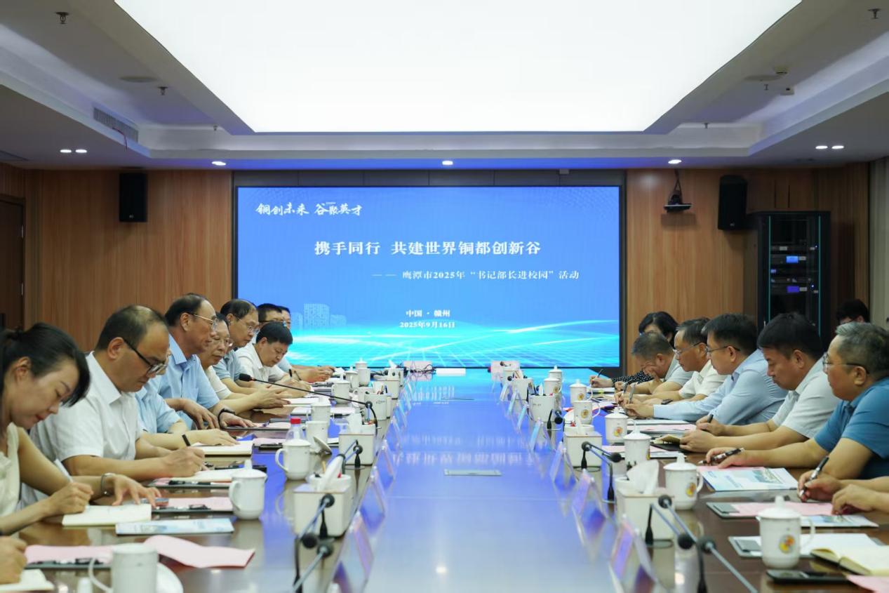 本网讯 9月16日,“智汇鹰潭 才赢未来”为主题的“书记部长进校园”活动暨“世界铜都创新谷”签约活动在我校举行。鹰潭市委书记许南吉,市政府副市长毛建华,高新区党工委书记周谷昌,贵溪市委副书记、市政府市长、贵溪经开区党工委书记潘磊等一行来校交流。校党委书记杨斌,中国工程院院士、校长葛世荣,副校长汪航等出席座谈会。