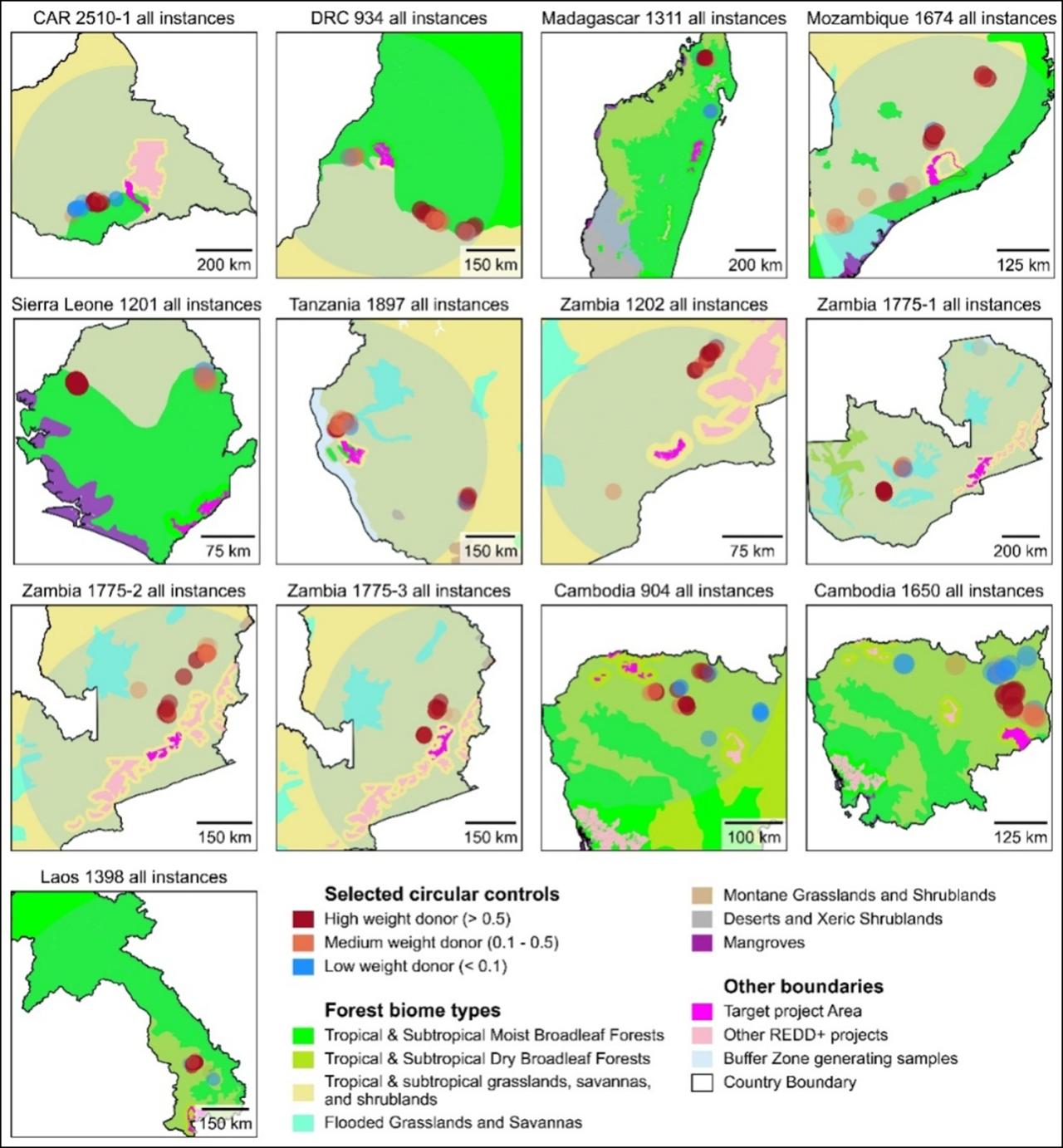 面对这一挑战,李清泉院士带领深圳大学和光明实验室团队开展攻关研究,评估了迄今为止最大规模的自愿REDD+项目的真实气候效益(涵盖12个热带国家共计52个自愿REDD+项目(66个项目单元))(图1)。团队基于多种合成控制法、多源遥感地理大数据和多轮随机实验,综合考虑各类时变毁林风险因子和时空特征匹配算法,发展了一套透明可靠的自愿性REDD+项目动态基线构建方法,实现了项目和区域尺度上的REDD+项目的气候效益的准确量化。该方法通过在项目区周边不受保护的地带,严格匹配与项目区实施REDD+前地理空间特征和历史森林砍伐动态一致的地块得到基线参考区(控制区)(图2),基线参考区的森林变化动态可认为是项目区未实施REDD+的基线情景。该方法生成的动态基线能够融合外部环境变化,有效克服传统静态基线无法反映毁林驱动因子动态变化的缺陷。同时,基线毁林面积可通过卫星影像监测得到,使计算更透明、验证更便捷,且不易被人为干预。