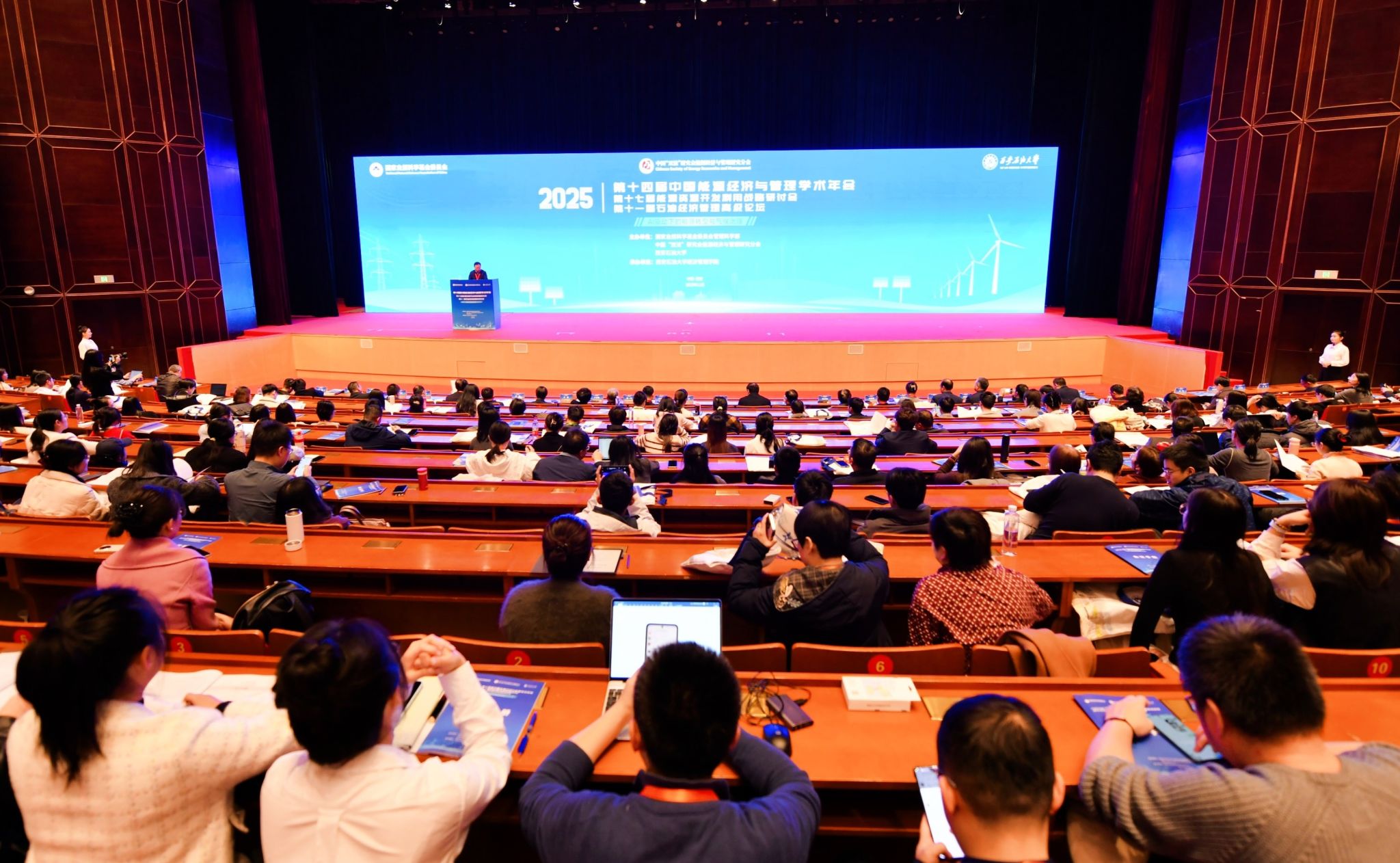 本次会议以“AI驱动下的能源转型与气候治理”为主题,旨在促进我国能源经济与管理研究领域专家学者的交流与合作,搭建经验分享、路径研讨的交流平台。会议共收到303篇投稿论文,设开幕式、主题报告、专项项目交流、期刊编辑论坛、并行专题报告、优秀博士学位论文颁奖、闭幕式等环节。会议设置了11场主题报告,并组织了20个并行会场,273个分组报告。与会专家学者分别围绕能源系统转型、气候影响与风险、数字经济与人工智能、能源供应链管理、低碳城市建设、行业减排技术与路径、碳市场与碳定价、可再生能源发展、企业低碳运营等热点议题进行交流探讨,共同呈现了一场场精彩的学术盛宴。