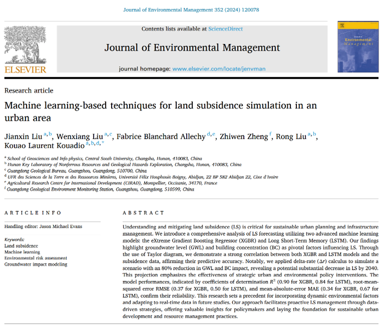 本网讯 近日,中南大学地球科学与信息物理学院柳建新教授团队在国际环境科学与生态学顶尖学术期刊Journal of Environmental Management(《环境管理杂志》)发表了城市地面沉降智能化预测的研究成果“Machine learning-based techniques for land subsidence simulation in an urban area(基于机器学习的城市地面沉降智能化预测研究)”。