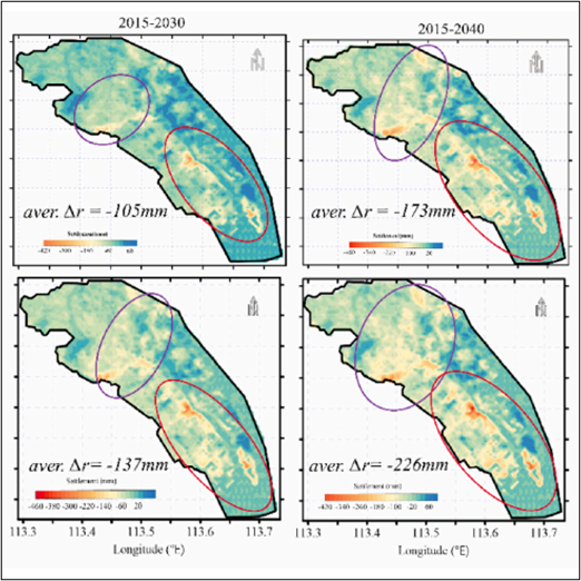 珠三角地区的沉降面积达到11397平方公里,沉降幅度普遍超过500毫米,最高可达1000毫米以上。由于土地沉降导致周边建筑物的开裂或坍塌、道路裂缝、地面倾斜等问题,土地沉降已经成为影响珠三角地区经济可持续发展的重要风险之一。团队联合广东省地质环境监测总站、广东省第四地质大队、科特迪瓦博瓦尼大学,基于广州南沙区Sentinel-1卫星影像、地质结构、工程水文地质钻孔等资料,提取了该地区2015~2022年逐年沉降量、地层岩性、回填土厚度与砂层分布、建筑物密度、地下水位信息,使用极端梯度提升回归器与长短期记忆网络建立了地面沉降智能化预测模型,研究了多种因素对该地区未来地面沉降速率的影响,为地面沉降监测预警与城市发展规划提供了技术支撑。