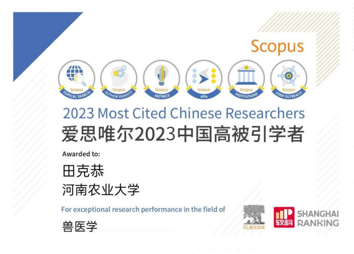 近日,爱思唯尔(Elsevier)重磅发布2023“中国高被引学者”(Highly Cited Chinese Researchers)榜单,此榜单以全球权威的引文与索引数据库Scopus作为中国学者科研成果的统计来源。本次共计有来自496所高校、企业及科研机构的5801人上榜,覆盖了教育部10个学科领域、84个一级学科。其中,普莱柯田克恭研究员成功入选该榜单,这也是田克恭自2021年以来连续三年入选。经查询,田克恭是畜牧兽医领域唯一供职于企业的上榜学者。
